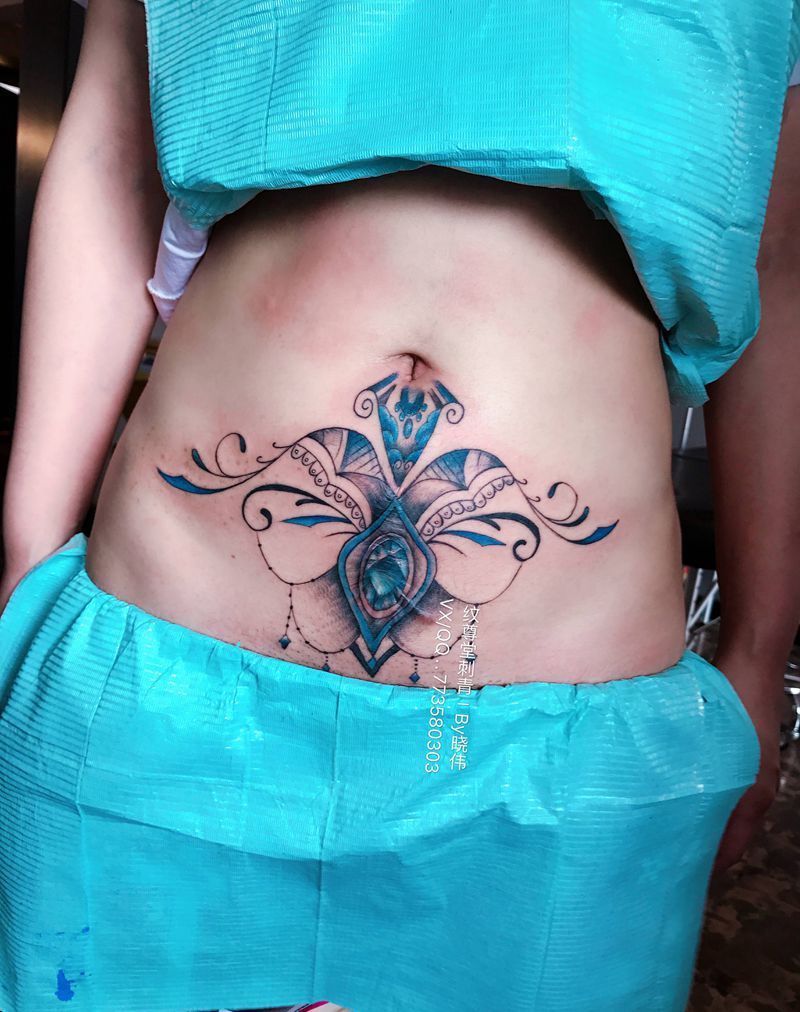 疤痕遮盖作品纹身图片_腹部手臂水彩点刺纹身图案