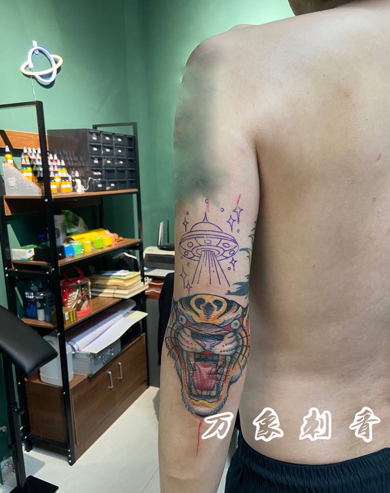 当前位置: 首页 >河北省唐山市纹身店-万象刺青纹身图案>old school老虎头爆肘纹身图片_手臂Old School纹身图案