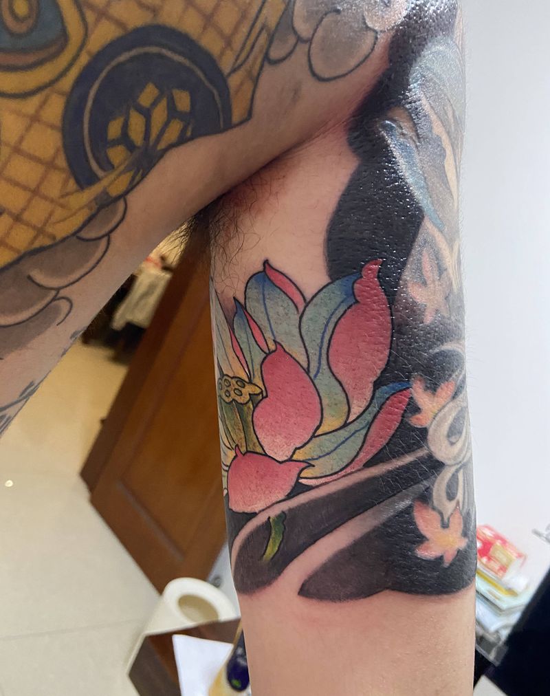 当前位置: 首页 >河北省唐山市纹身店-万象刺青纹身图案>花臂添加老传统莲花纹身图片_手臂老传统纹身图案