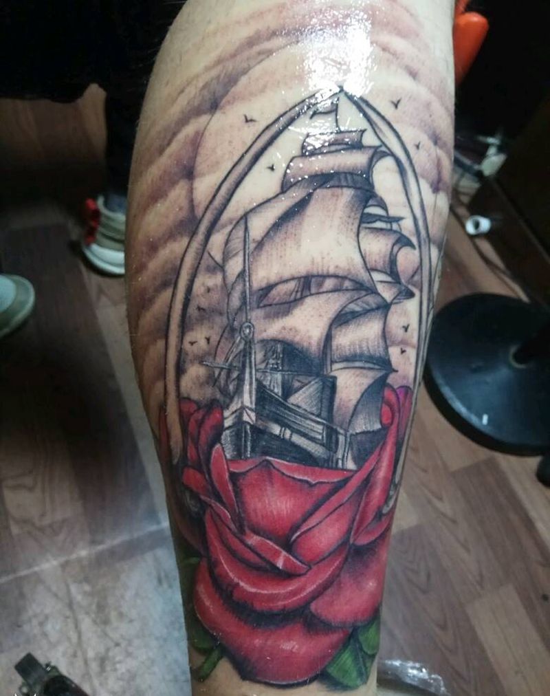 一帆风顺爱的海洋纹身图片_腿部欧美清新写实原创手稿纹身图案