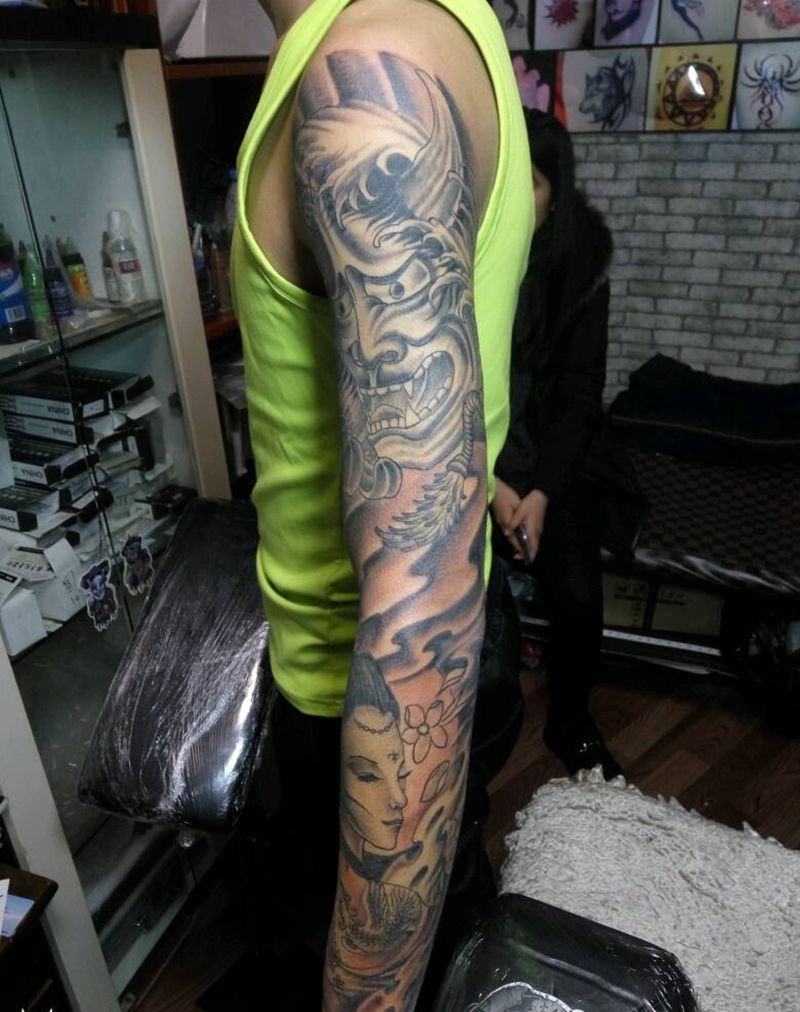 当前位置: 首页 >河北省秦皇岛市纹身店-秦皇刺青纹身图案>般若艺姬黑白灰花臂纹身图片_手臂传统人物纹身图案
