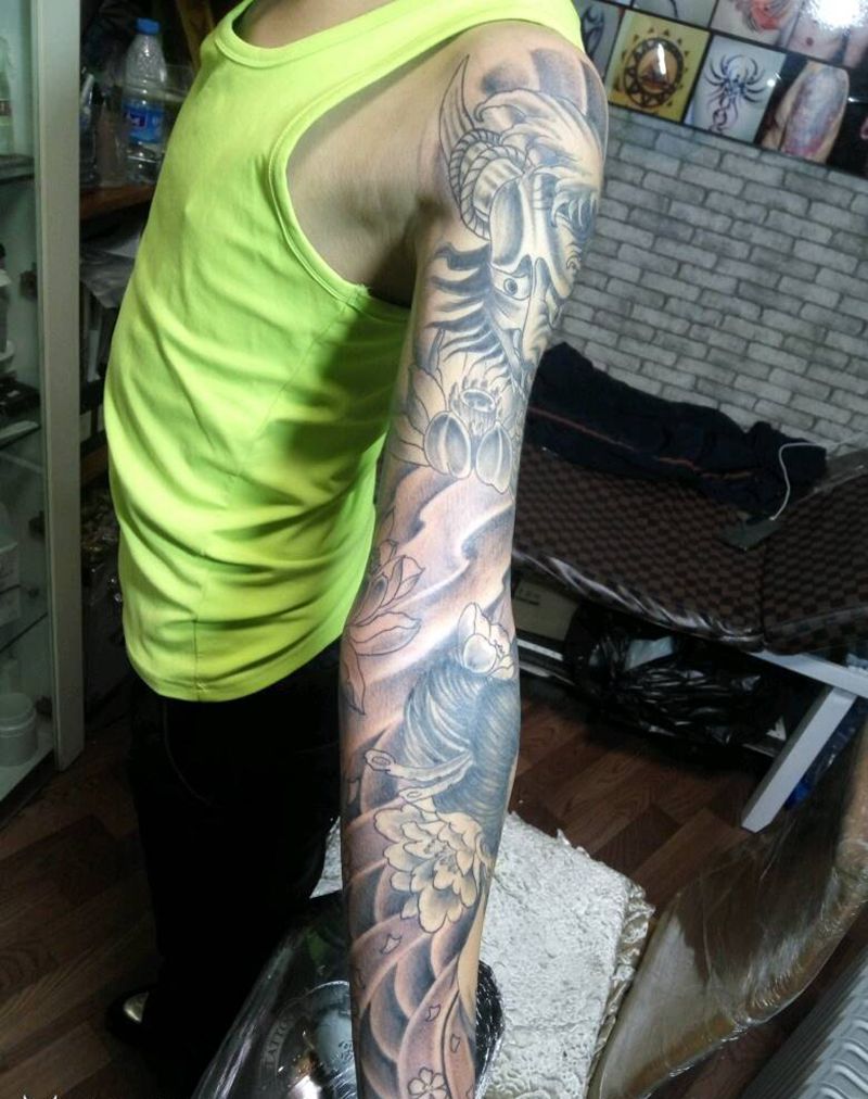 当前位置: 首页 >河北省秦皇岛市纹身店-秦皇刺青纹身图案>般若艺姬黑白灰花臂纹身图片_手臂传统人物纹身图案