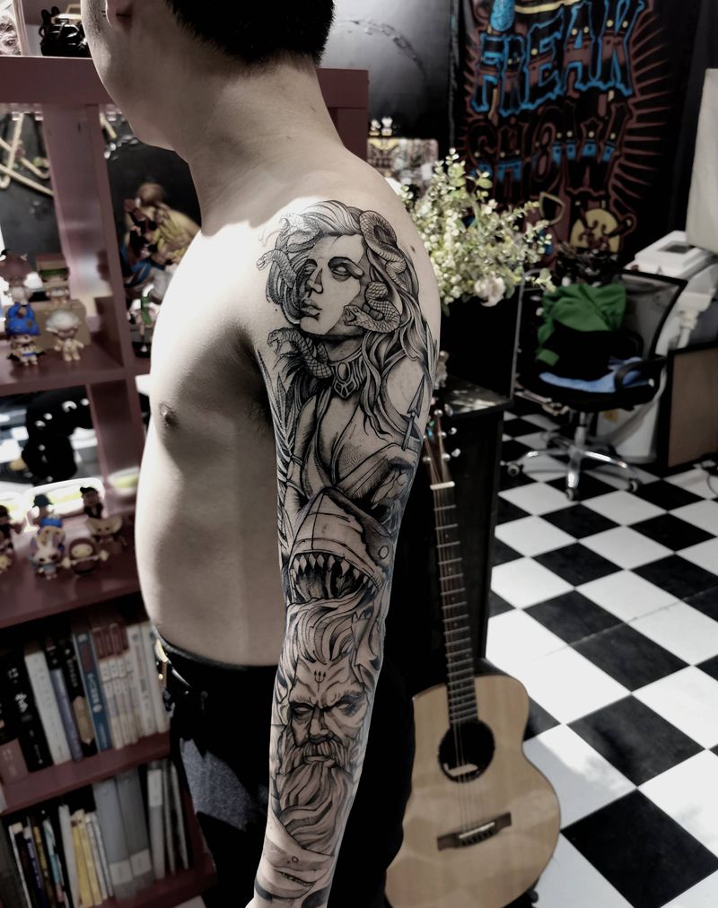 当前位置: 首页 >河北省唐山市纹身店-D1刺青纹身图案>点刺风格美杜莎波塞冬花臂纹身图片_New School点刺点刺花臂纹身图案