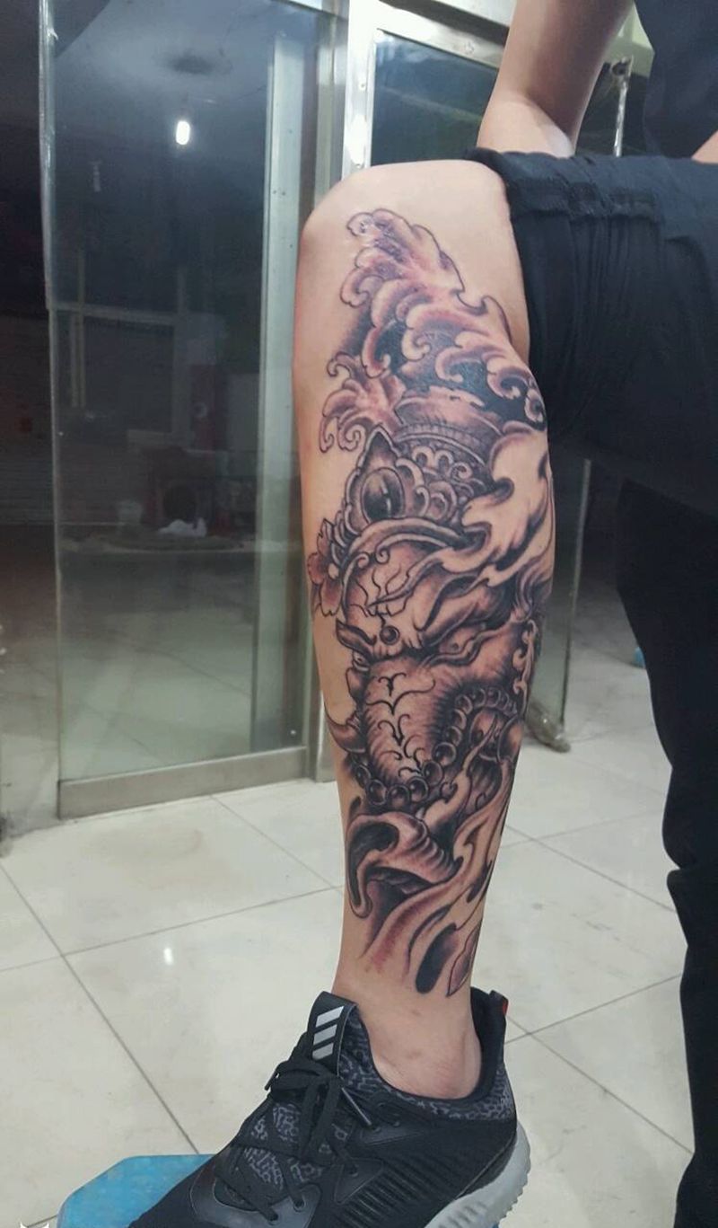 • T网红王老大花腿龙纹身图片_腿部新传统纹身图案