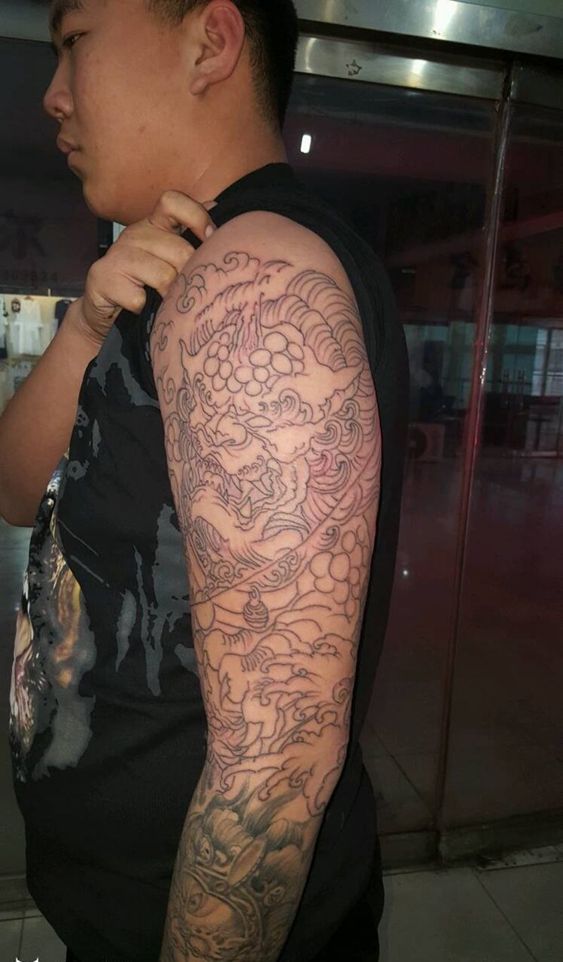 当前位置: 首页 >河北省唐山市纹身店-大明刺客纹身纹身图案>包大臂唐狮线条纹身图片