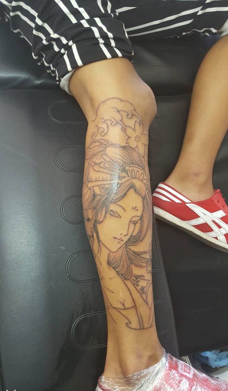 当前位置: 首页 >河北省唐山市纹身店-大明刺客纹身纹身图案>小腿艺妓线条纹身图片