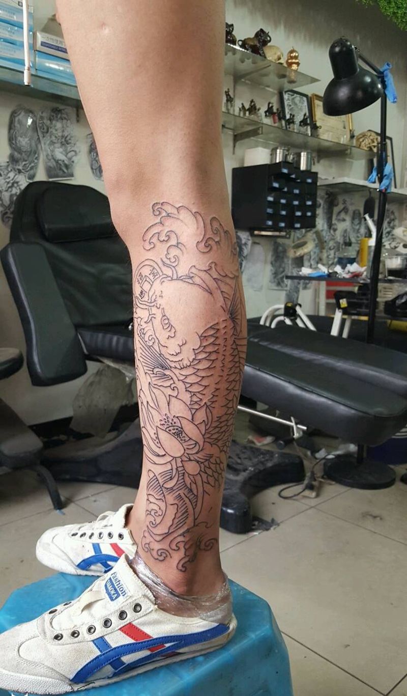• T网红王老大花腿龙纹身图片_腿部新传统纹身图案