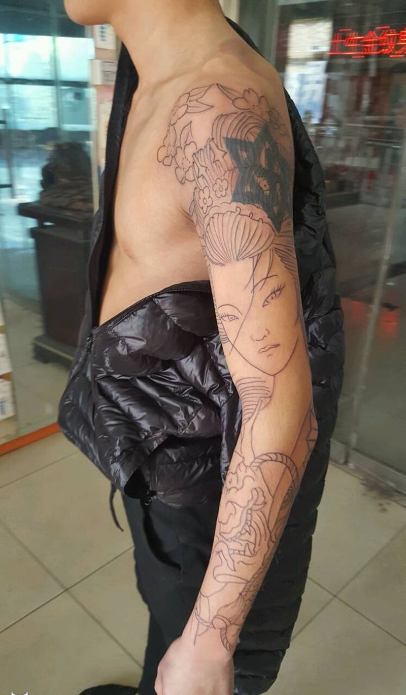 当前位置: 首页 >河北省唐山市纹身店-大明刺客纹身纹身图案>艺妓线条纹身图片