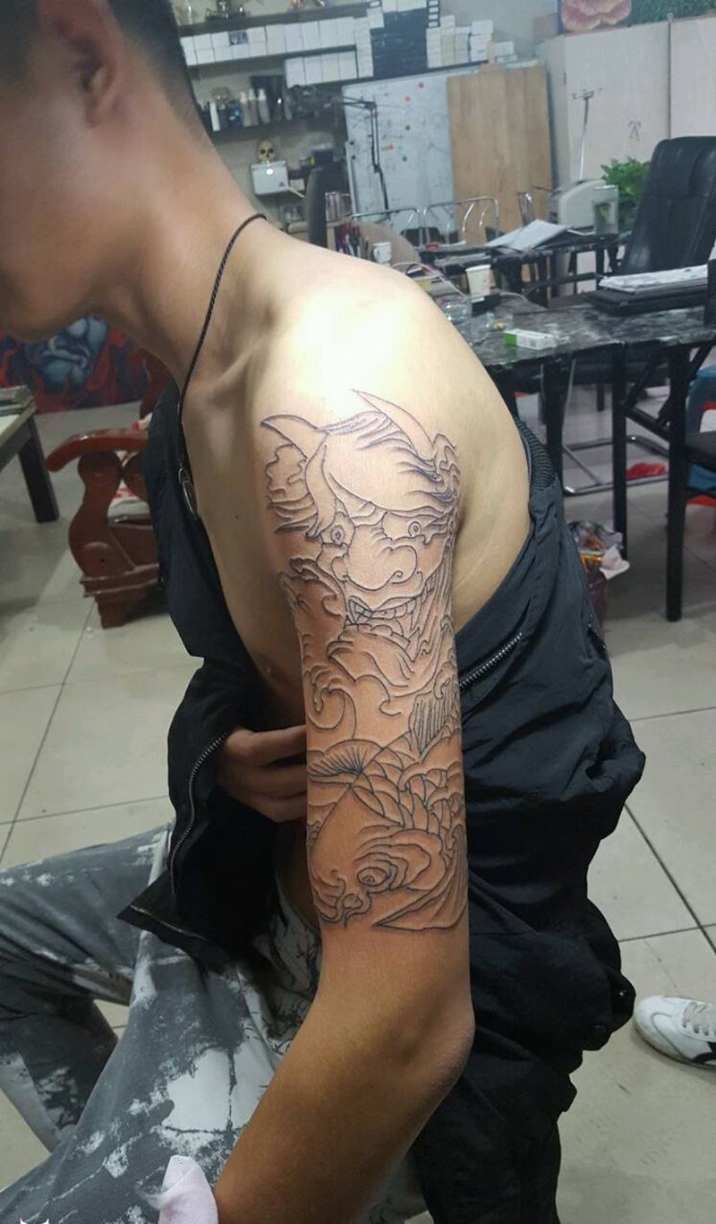 当前位置: 首页 >河北省唐山市纹身店-大明刺客纹身纹身图案>般若线条大臂外侧纹身图片