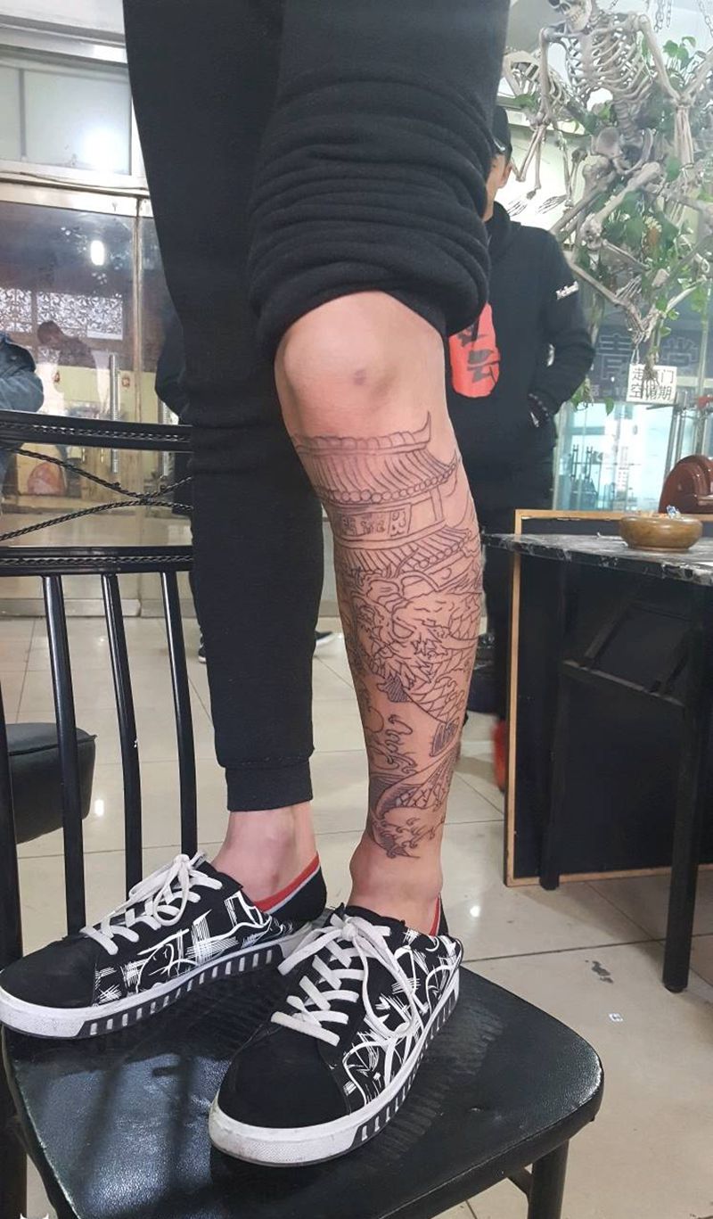 • T网红王老大花腿龙纹身图片_腿部新传统纹身图案