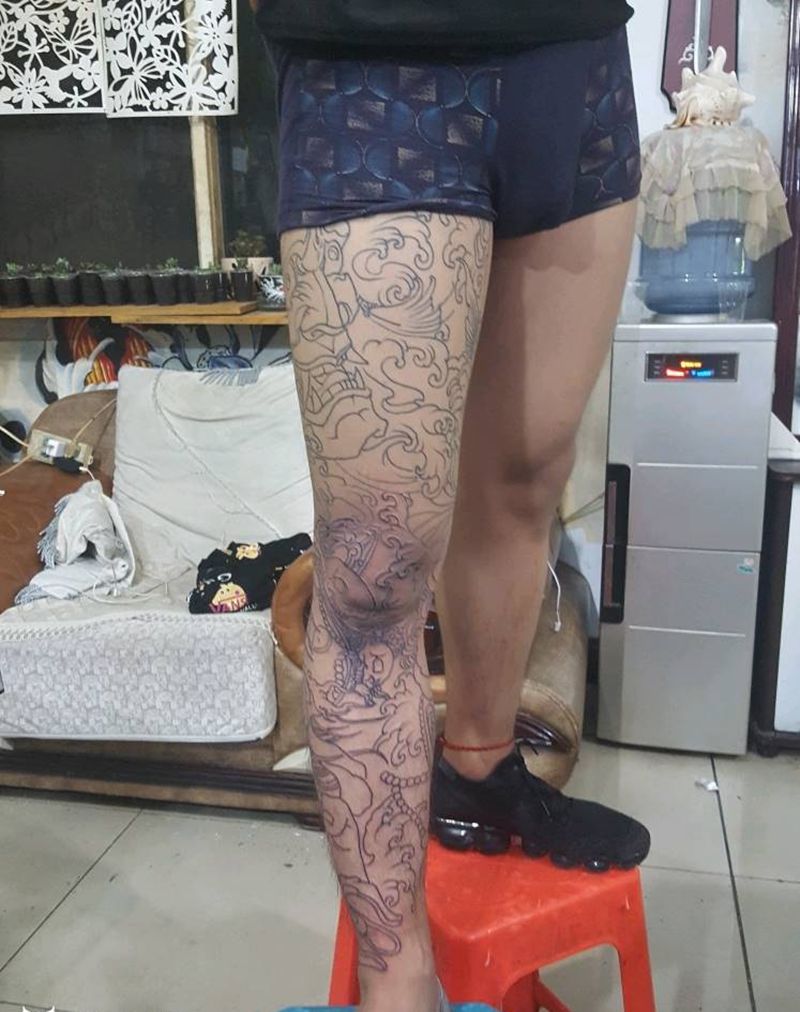 • T网红王老大花腿龙纹身图片_腿部新传统纹身图案