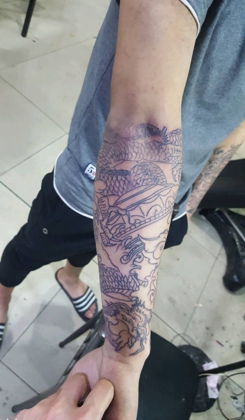 • T网红王老大花腿龙纹身图片_腿部新传统纹身图案