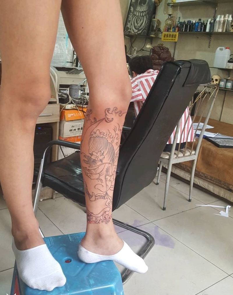 • T网红王老大花腿龙纹身图片_腿部新传统纹身图案