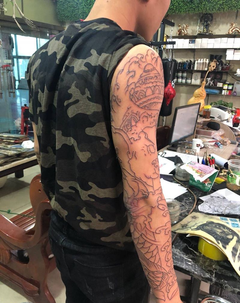 当前位置: 首页 >河北省唐山市纹身店-大明刺客纹身纹身图案>花臂线条纹身图片