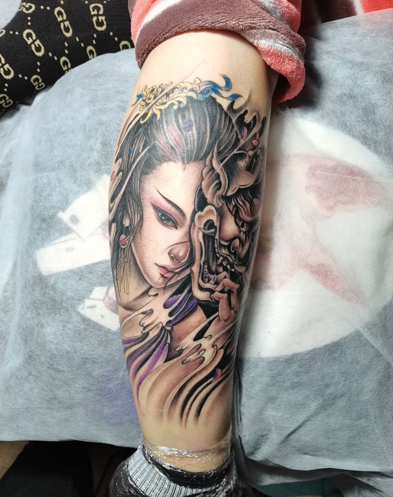 艺伎纹身图片_腿部新传统纹身图案