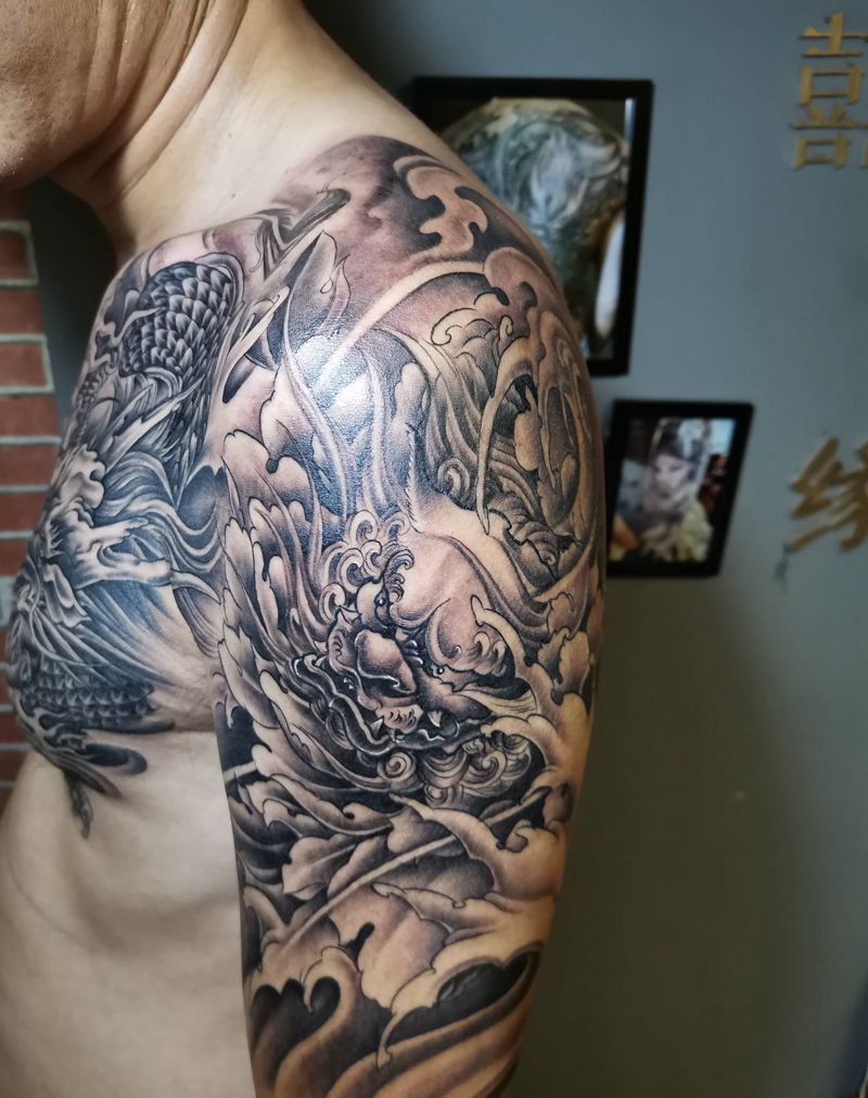 麒麟唐狮纹身图片_肩部手臂新传统纹身图案