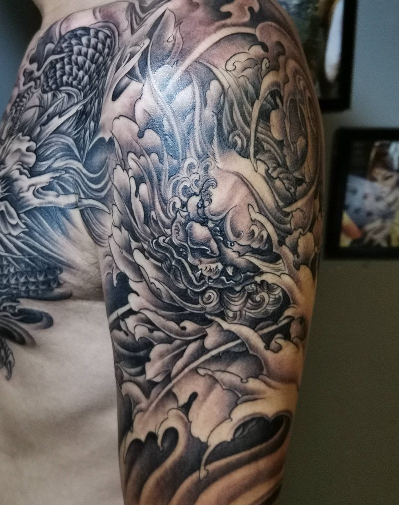 麒麟唐狮纹身图片_肩部手臂新传统纹身图案