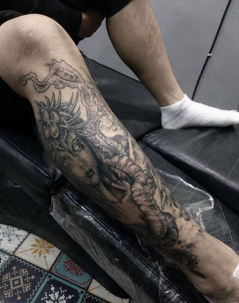 当前位置: 首页 >河北省唐山市纹身店-黑帆刺青纹身图案>暗黑纹身图片_腿部欧美写实New School纹身图案