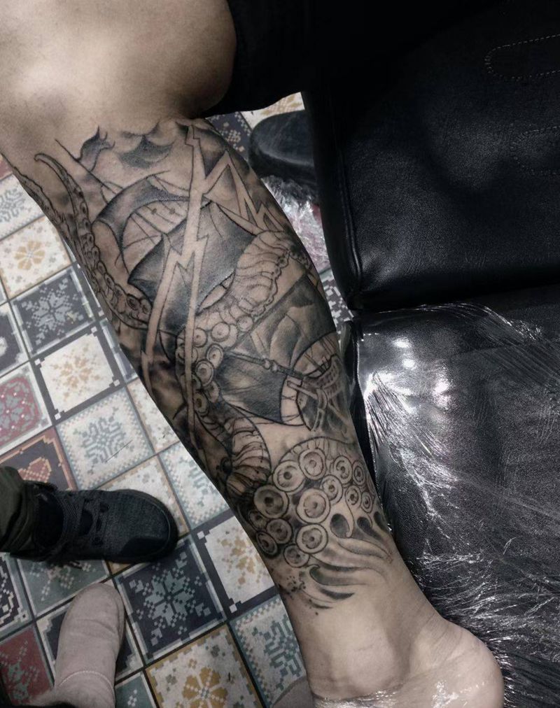 当前位置: 首页 >河北省唐山市纹身店-黑帆刺青纹身图案>暗黑纹身图片_腿部欧美写实New School纹身图案