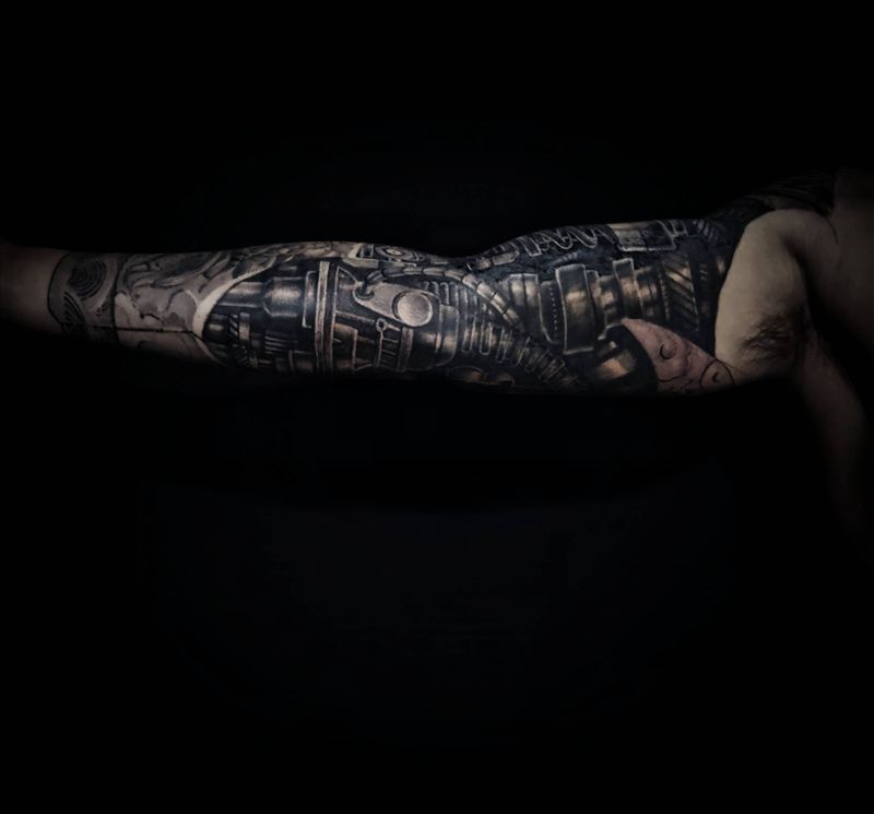 石雕加机械手臂纹身图片_手臂欧美写实纹身图案