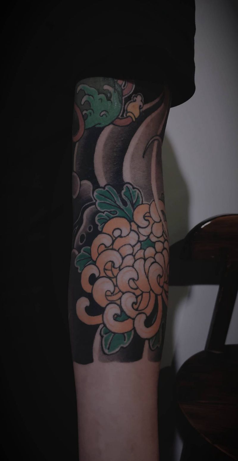 当前位置: 首页 >河北省邯郸市纹身店-色界刺青纹身图案>老传统菊花臂纹身图片_手臂老传统纹身图案