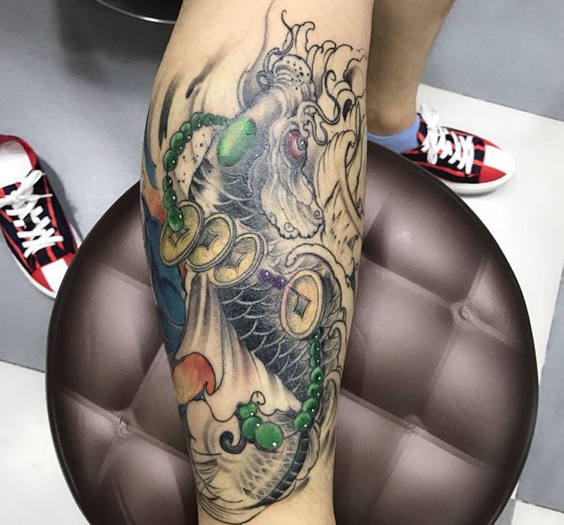 • T网红王老大花腿龙纹身图片_腿部新传统纹身图案