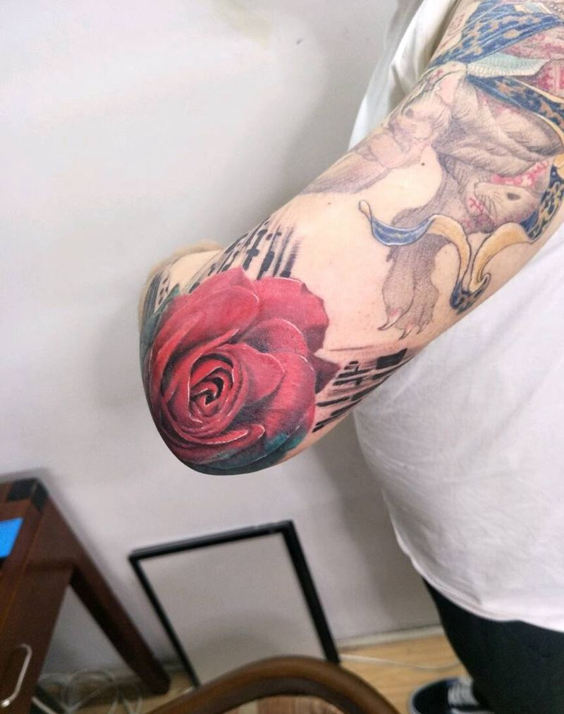 当前位置: 首页 >河北省秦皇岛市纹身店-雾隐刺青纹身图案>玫瑰肘关节纹身图片_手臂欧美写实水墨纹身图案