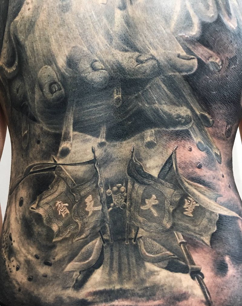 当前位置: 首页 >河北省秦皇岛市纹身店-雾隐刺青纹身图案>降魔篇纹身图片_背部欧美写实新传统石雕。纹身图案
