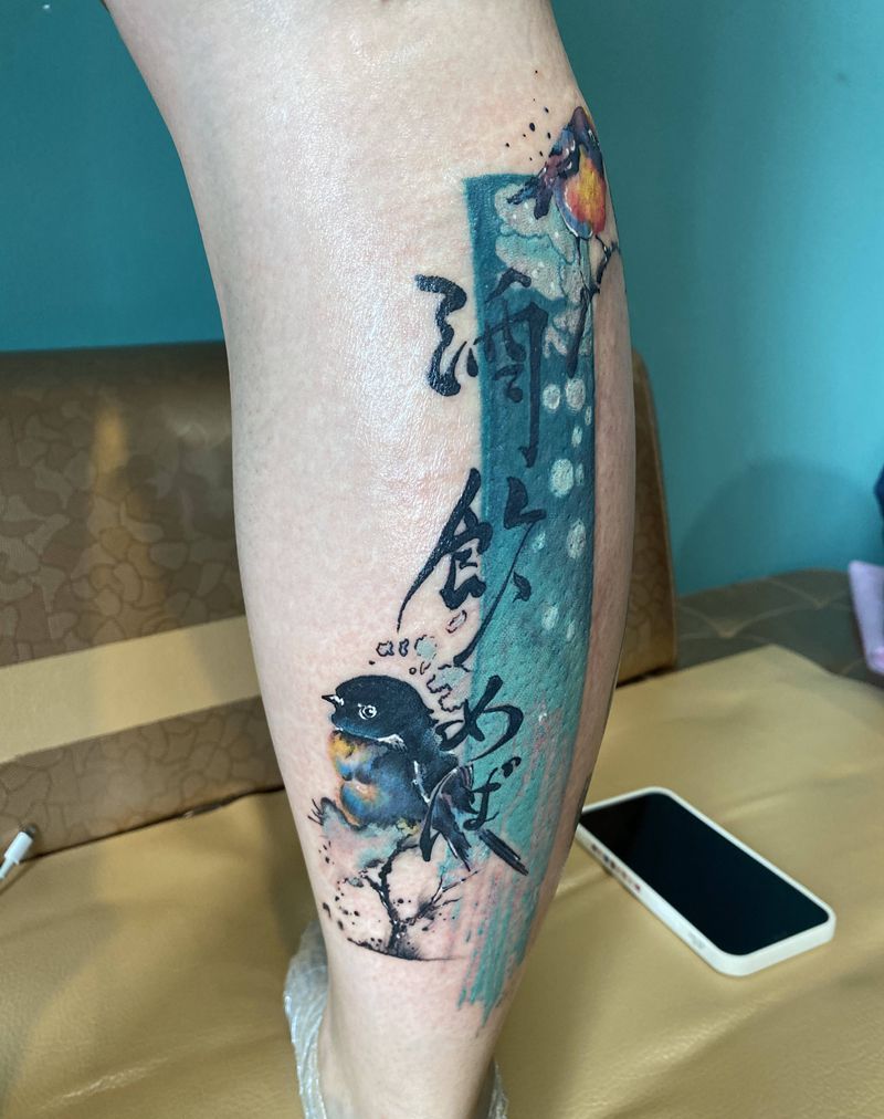 当前位置: 首页 >河北省邯郸市纹身店-帝易纹身总师父店纹身图案>中国风水彩纹身图片_腿部水墨水彩纹身图案