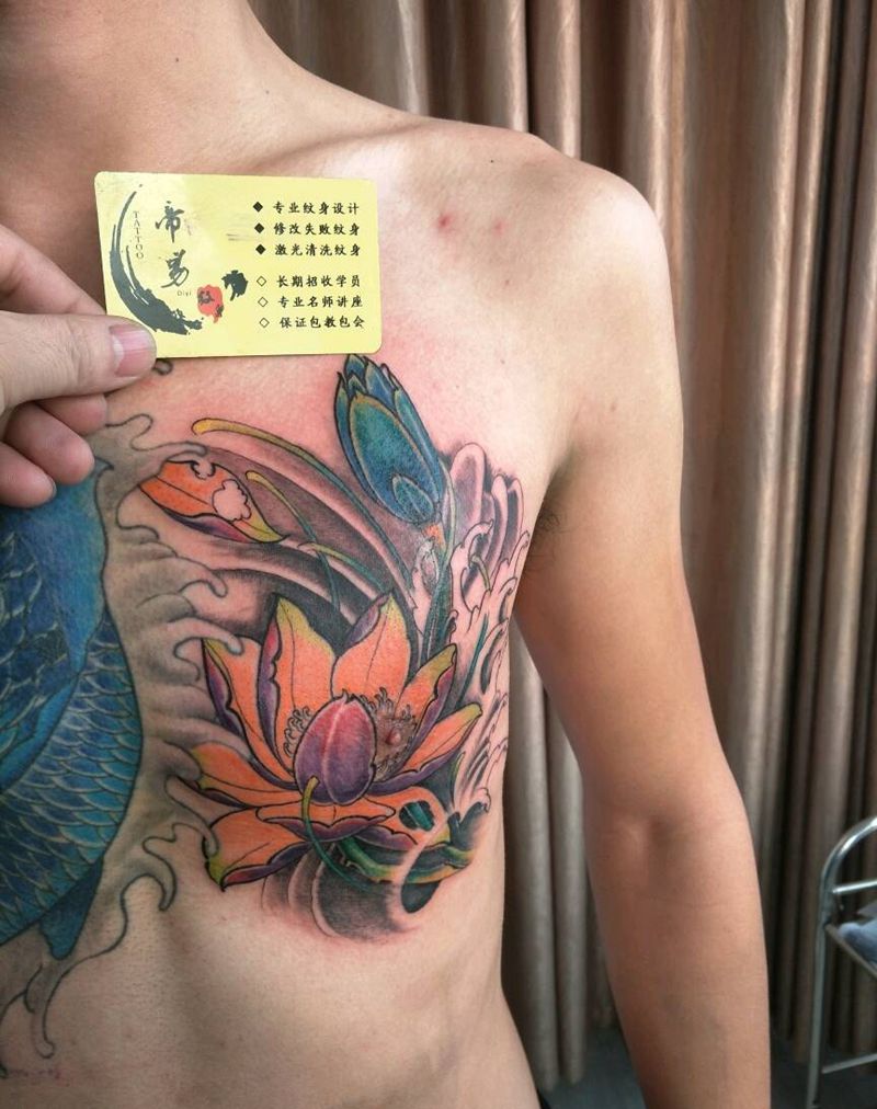 当前位置: 首页 >河北省邯郸市纹身店-帝易纹身总师父店纹身图案>荷花纹身图片_胸部传统植物成品纹身图案