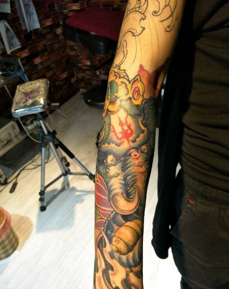 当前位置: 首页 >河北省邯郸市纹身店-帝易纹身总师父店纹身图案>深色象神纹身图片_手臂传统鬼神成品纹身图案