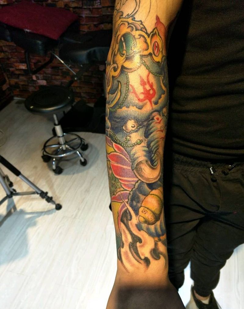 当前位置: 首页 >河北省邯郸市纹身店-帝易纹身总师父店纹身图案>深色象神纹身图片_手臂传统鬼神成品纹身图案