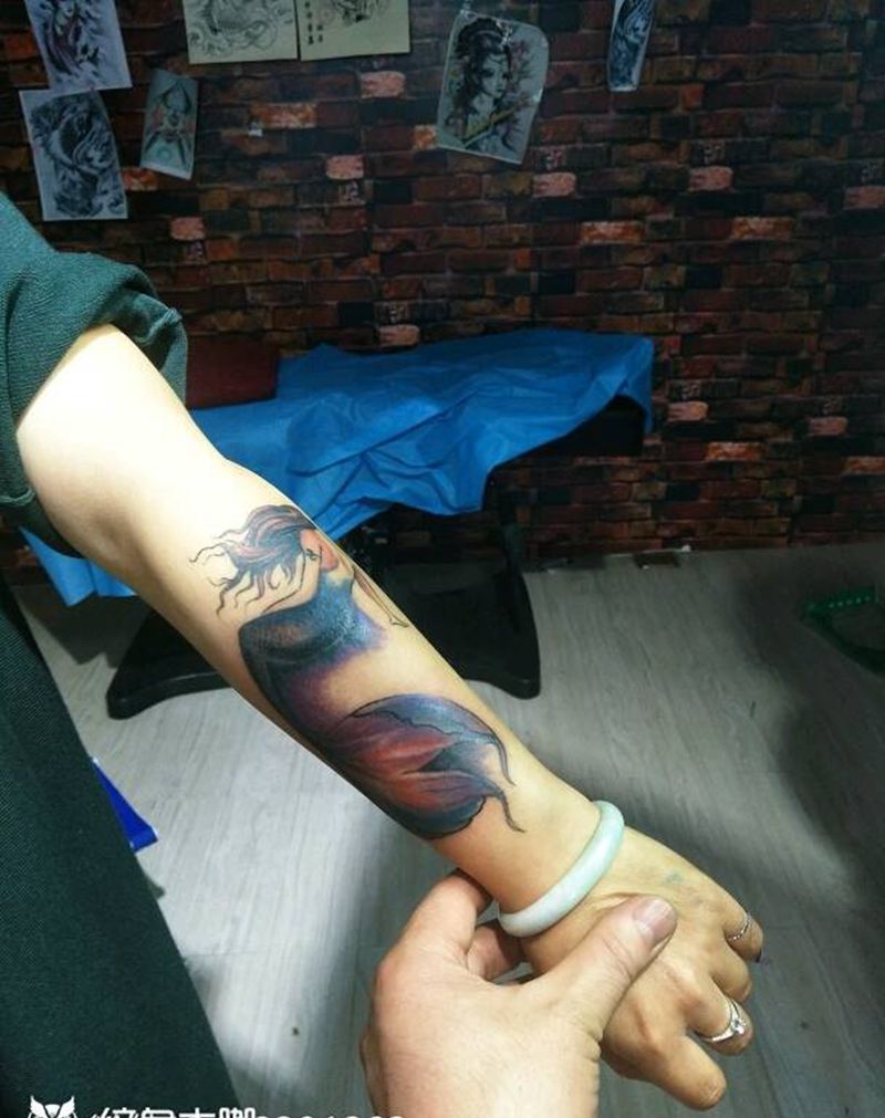 当前位置: 首页 >河北省邯郸市纹身店-帝易纹身总师父店纹身图案>美人鱼纹身图片_手臂清新人物成品手稿纹身图案