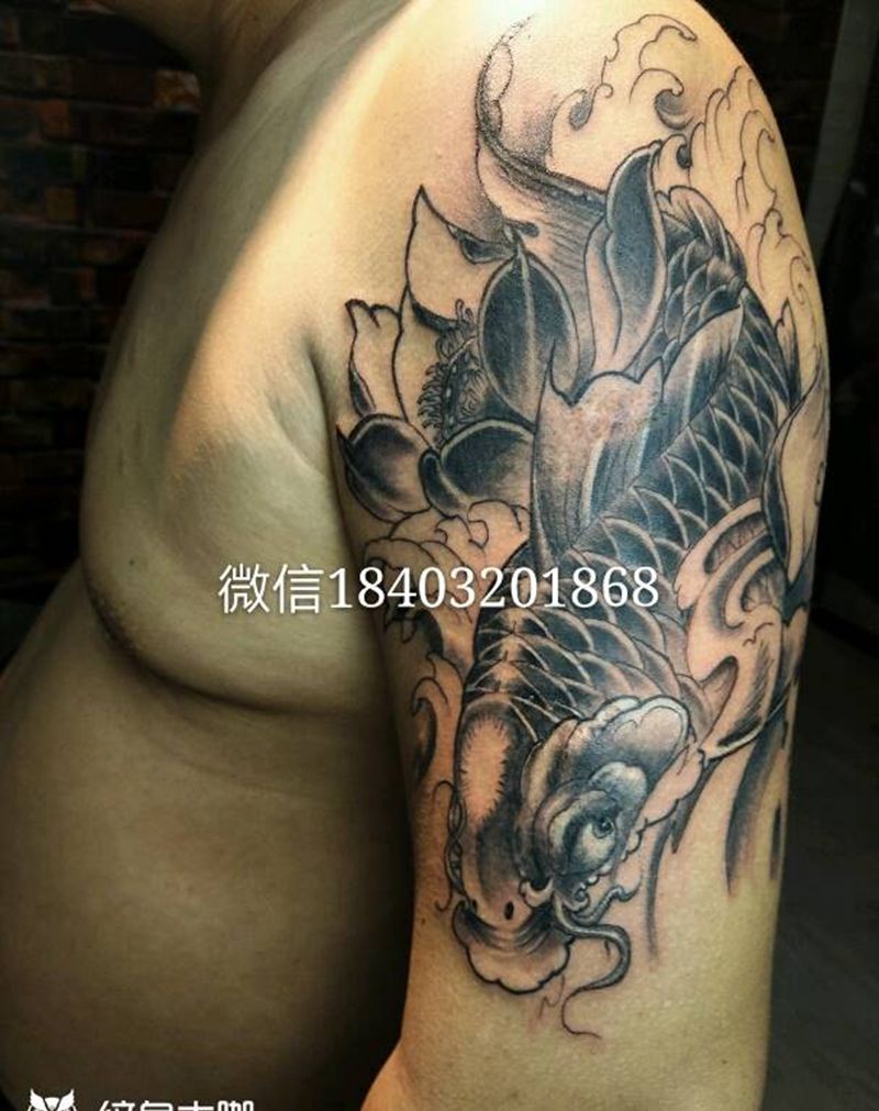 当前位置: 首页 >河北省邯郸市纹身店-帝易纹身总师父店纹身图案>招财鱼纹身图片_肩部手臂传统动物成品纹身图案