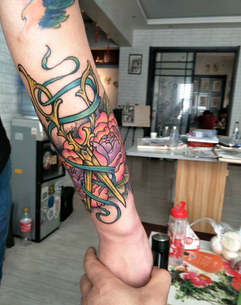 当前位置: 首页 >河北省邯郸市纹身店-帝易纹身总师父店纹身图案>金剪刀纹身图片_手臂欧美静物成品纹身图案