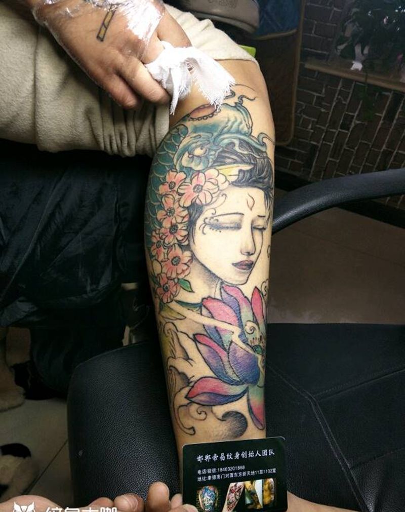 特价图恢复两个月后。纹身图片_腿部传统写实人物鬼神成品纹身图案