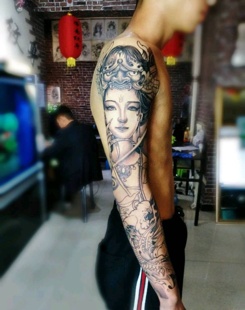 当前位置: 首页 >河北省邯郸市纹身店-帝易纹身总师父店纹身图案>遮盖花臂纹身图片_手臂传统动物人物成品纹身图案