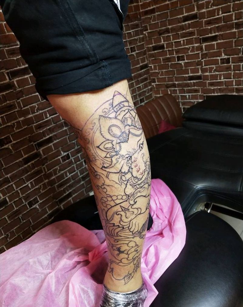 • T网红王老大花腿龙纹身图片_腿部新传统纹身图案