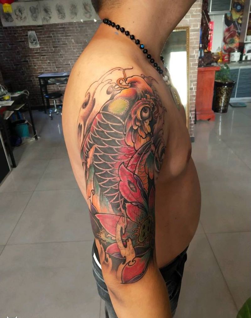 红鲤鱼与绿鲤鱼纹身图片_肩部传统动物成品纹身图案