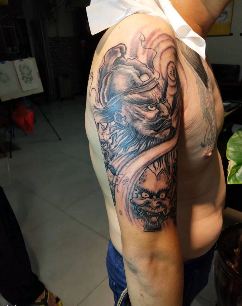 当前位置: 首页 >河北省邯郸市纹身店-帝易纹身总师父店纹身图案>知道怎么叫赚钱吗?纹身图片_肩部手臂传统人物鬼神成品纹身图案