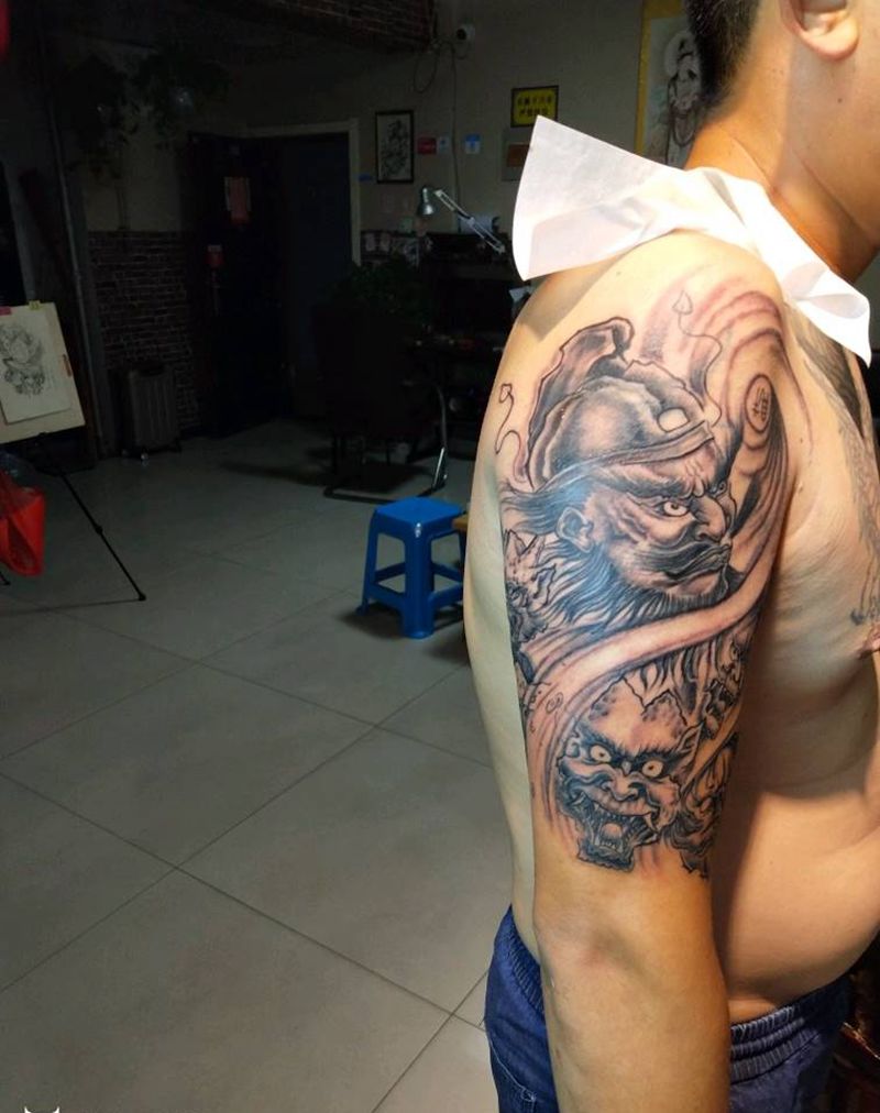 当前位置: 首页 >河北省邯郸市纹身店-帝易纹身总师父店纹身图案>知道怎么叫赚钱吗?纹身图片_肩部手臂传统人物鬼神成品纹身图案
