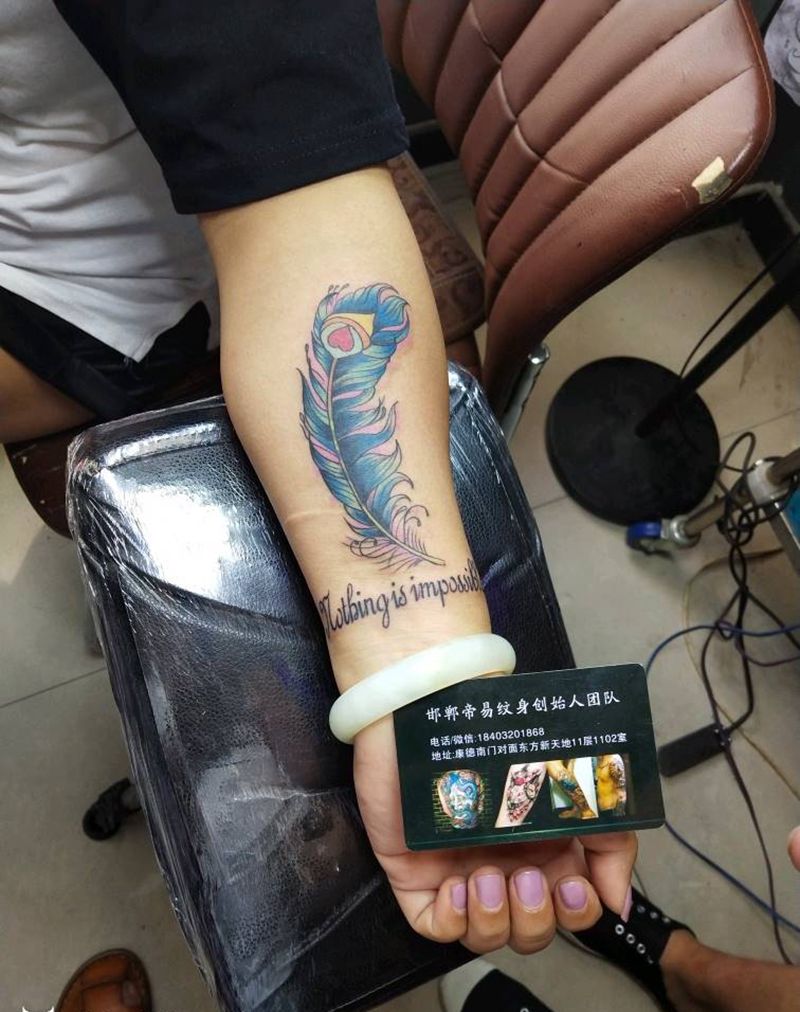 当前位置: 首页 >河北省邯郸市纹身店-帝易纹身总师父店纹身图案>鸡毛纹身图片_手臂清新静物成品纹身图案