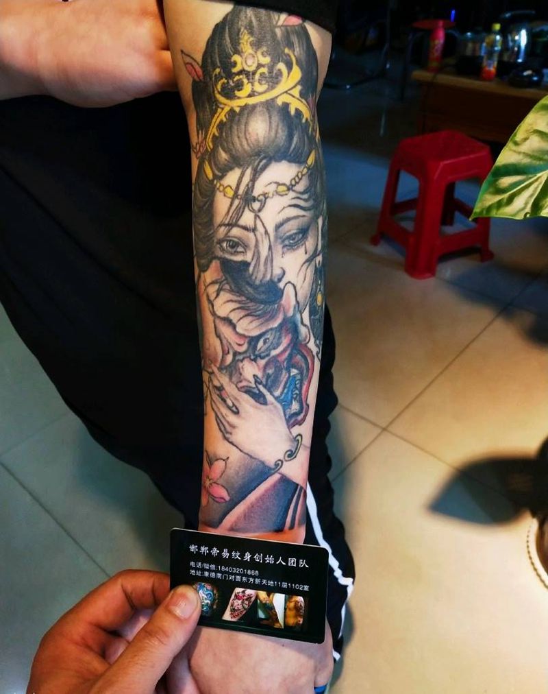 当前位置: 首页 >河北省邯郸市纹身店-帝易纹身总师父店纹身图案>艺妓纹身图片_手臂传统人物成品纹身图案