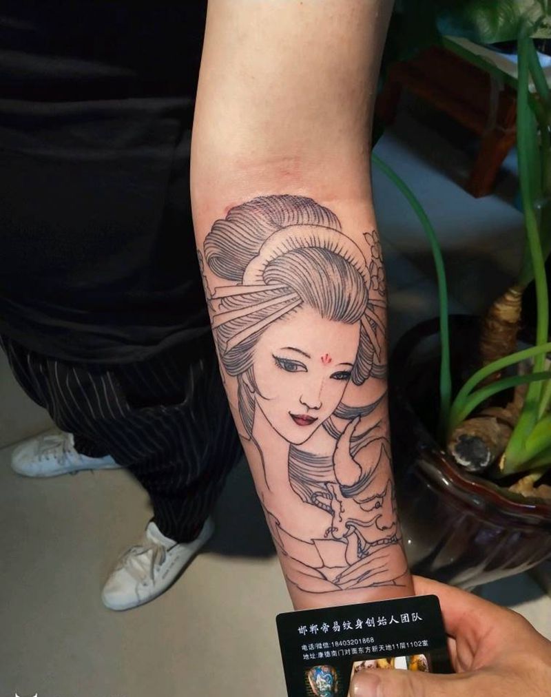 徒弟给顾客扎的艺妓线条纹身图片_手臂传统人物成品纹身图案