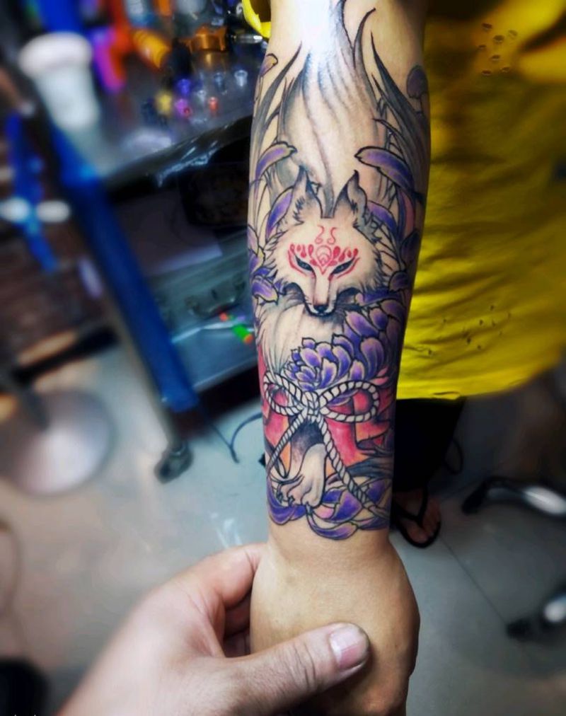 当前位置: 首页 >河北省邯郸市纹身店-帝易纹身总师父店纹身图案>九尾灵狐纹身图片_手臂传统清新动物鬼神成品纹身图案