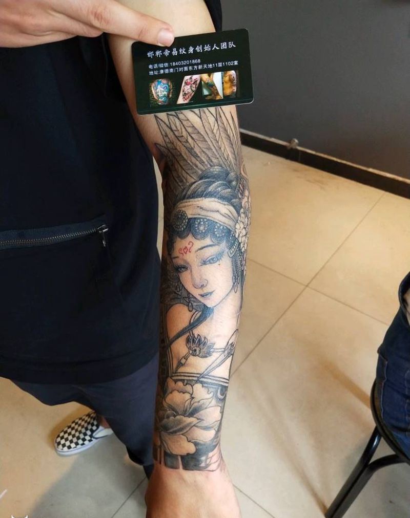 当前位置: 首页 >河北省邯郸市纹身店-帝易纹身总师父店纹身图案>艺妓纹身图片_手臂传统人物成品纹身图案