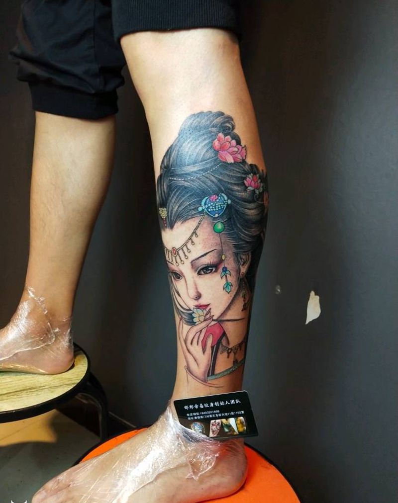 美女纹身图片_腿部新传统艺妓美女纹身图案