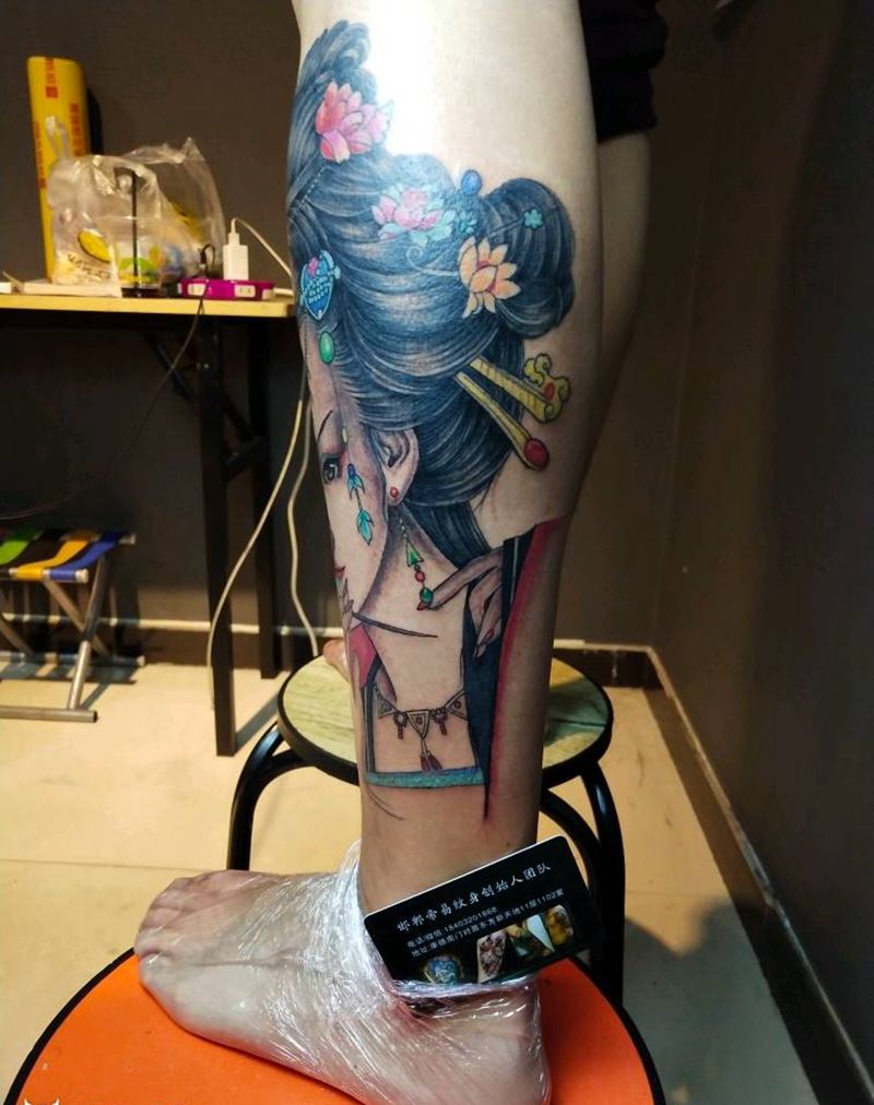 当前位置: 首页 >河北省邯郸市纹身店-帝易纹身总师父店纹身图案>美女纹身图片_腿部新传统艺妓美女纹身图案