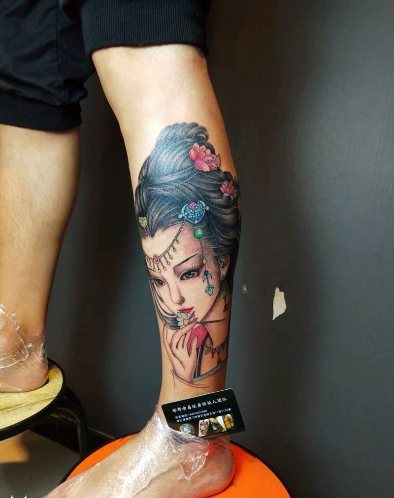 美女纹身图片_腿部新传统艺妓美女纹身图案
