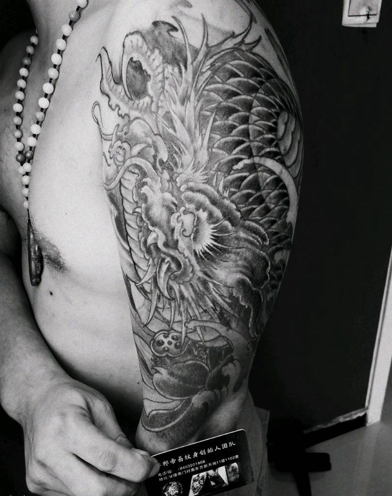 当前位置: 首页 >河北省邯郸市纹身店-帝易纹身总师父店纹身图案>龙吃鱼纹身图片_肩部手臂新传统龙纹身图案